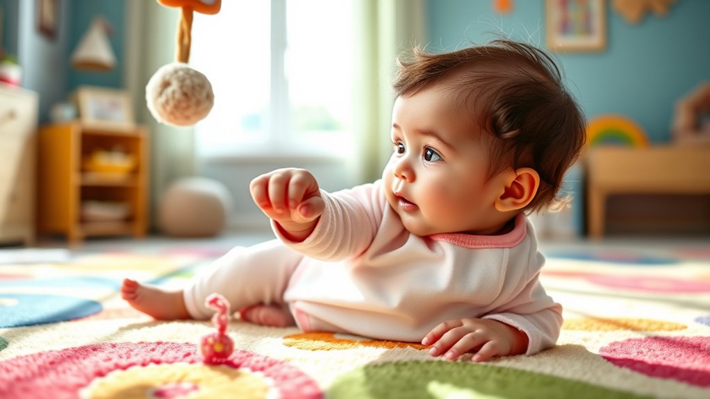 Between 4 and 6 months, your baby undergoes exciting developmental changes that lay the foundation for future growth. During this time, you’ll notice your little one becoming more curious about the world around them. Sensory exploration takes center stage as they reach for and grasp objects, feeling different textures and discovering new sensations. This active engagement helps strengthen their hand-eye coordination and fine motor skills. As they explore their environment, they also learn about cause and effect—like understanding that shaking a rattle produces a sound or that pressing a button makes a toy light up. These experiences are essential for their cognitive development and help build their confidence in interacting with objects. Incorporating educational toys that promote sensory and motor skills can further support their development during this stage. Social interaction also becomes more dynamic at this stage. Your baby starts to recognize familiar faces, smiling more often and perhaps even giggling at playful interactions. They may begin to imitate simple gestures or expressions, showing early signs of communication. Responding to their smiles and sounds encourages them to keep engaging and helps deepen your bond. You might notice them turning their head towards voices or looking at people more intently, keen to connect with those around them. These social cues are fundamental as they start to develop emotional awareness and understanding of social norms. Reaching and grasping become more intentional during these months. Your baby will likely start to stretch out their arms to grab toys or your fingers, demonstrating improved muscle control. They may also begin to transfer objects from one hand to the other, which is a significant milestone in developing coordination. As they practice these skills, they learn patience and perseverance, which are essential for future learning. Playtime becomes more interactive, and you’ll enjoy seeing them explore different toys and household items. Always supervise their play to guarantee safety, but give them plenty of opportunities to explore their surroundings freely. Rolling over is another milestone that signals their growing strength and coordination. Some babies may start rolling from tummy to back, while others progress to rolling from back to tummy. These movements are not only fun to watch but also help develop their core muscles and spatial awareness. As your baby masters rolling, they gain a new sense of independence and can move around more freely during play. All these developments—sensory exploration, social interaction, reaching, grasping, and rolling—combine to make these months a time of rapid growth and discovery. Your active involvement and encouragement are key to helping your baby thrive during this exciting stage.