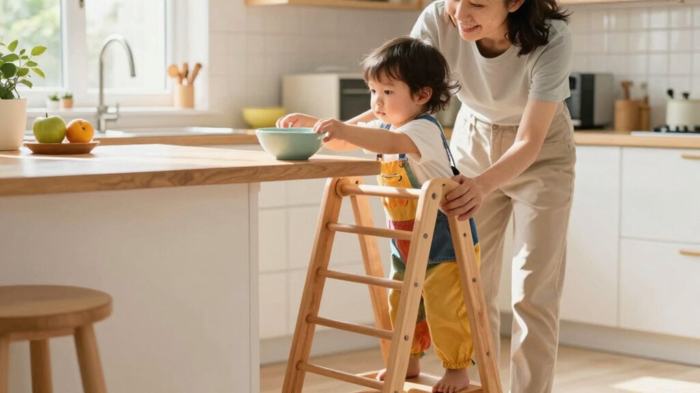 You’ll know your child is ready to use the learning tower when they show good balance, curiosity, and the ability to follow simple safety instructions. Observe their child development; they should be able to stand steadily and understand safety considerations. Make sure they’re comfortable climbing with supervision first. When they consistently demonstrate these skills and awareness, it’s a positive sign they’re ready for the learning tower, fostering independence safely.