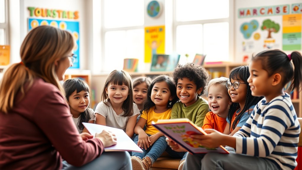 Creating a literacy-rich environment involves more than just choosing the right books; it means actively engaging your child with a variety of literacy activities that foster a love of reading at every stage. Use storytelling techniques to make stories come alive, encouraging your child to participate through questions or retelling. Incorporate visual aids like pictures, charts, or puppets to make stories more engaging and understandable. These tools help children connect words with images, strengthening comprehension and vocabulary. Create opportunities for your child to explore print through activities like labeling objects or drawing stories. By blending storytelling techniques with visual aids, you make literacy fun and interactive, nurturing curiosity and confidence. This active involvement helps develop a lifelong appreciation for reading and learning.
