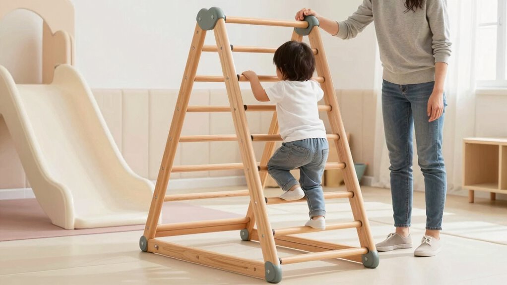 Supervising your child during play is essential to guarantee their safety on Pikler structures. Always provide active adult supervision, watching closely as they climb and move. Stay attentive to their actions, ready to intervene if they lose balance or attempt risky maneuvers. Keep the play area clear of hazards and ensure the structure is stable before use. It’s also important to be prepared for emergencies; have a first aid kit nearby and know basic first aid procedures. Establish clear rules for safe play and communicate them consistently. Remember, your presence acts as both a safeguard and a confidence booster for your child. By maintaining vigilant supervision and being prepared, you help create a safe environment where your child can explore and develop with confidence.