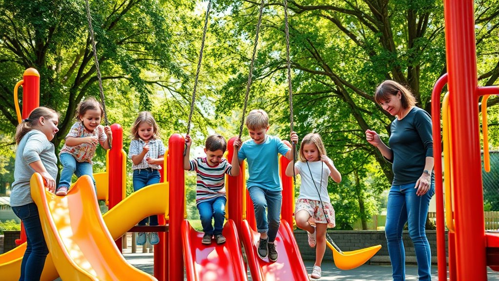 As a parent, you should supervise your kids closely, especially younger ones, to keep them safe and teach respectful play. Promote sharing, patience, and polite requests like “Can I have a turn?” by modeling good manners yourself. Encourage fair turn-taking and calm conflict resolution without taking sides. Consistently remind children about playground etiquette to foster kindness and cooperation. If you want to make certain of a positive, safe environment, keep these tips in mind as you guide your kids through playtime.
