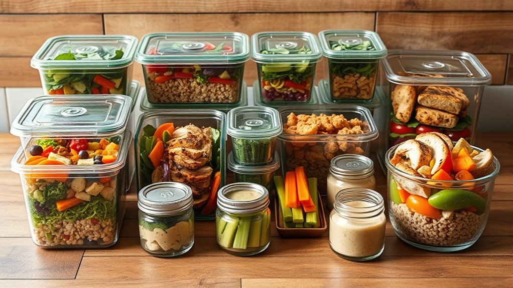 Storage tips are essential to keep your make-ahead lunches fresh and appetizing. Use airtight containers to prevent spills and maintain freshness. Clear containers help you see what’s inside, making it easier to grab your desired meal without rummaging through the fridge. Label your containers with the date to guarantee you consume everything while it’s still good. For salads and items with dressing, keep the dressing separate and add it just before eating to prevent sogginess. For items like sandwiches or wraps, consider wrapping them tightly in plastic wrap or foil before placing them in containers to avoid drying out.