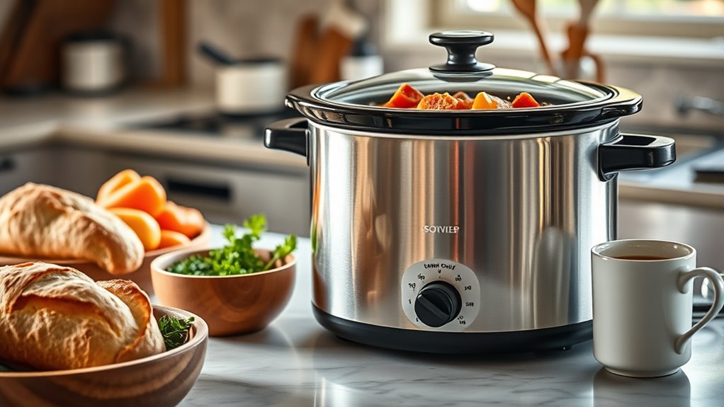 Using a slow cooker for family meals makes dinner planning simple and efficient. You can prep ingredients ahead of time, gather everything in the morning, and let it cook throughout the day. This saves you time and reduces last-minute stress while ensuring a hearty, homemade meal is ready when you need it. Plus, you can easily swap ingredients or tweak flavors to suit everyone’s tastes. Keep exploring to discover tips for making the most of your slow cooker.