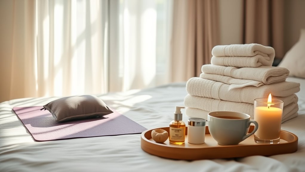 You can focus on skincare essentials like a gentle cleanser, moisturizer, and SPF for quick, effective care. Aromatherapy options, such as a calming essential oil roller or diffuser, boost relaxation in minutes. Keep these products handy, so you’re ready to unwind anytime. Using multitasking items, like a tinted moisturizer with SPF, helps you save time while nourishing your skin and calming your mind efficiently.