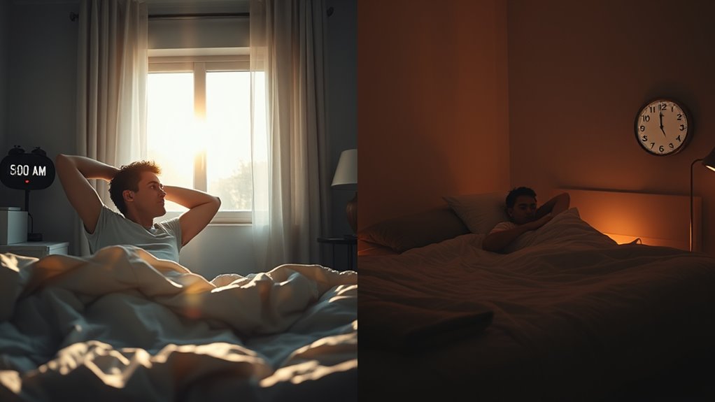 Your circadian rhythms heavily influence your sleep preferences by regulating melatonin production, which signals when you feel sleepy or alert. Light exposure, especially in the morning, helps suppress melatonin, making you feel more awake and aligned with daytime activities. Conversely, reduced light in the evening allows melatonin levels to rise, encouraging sleep. Understanding this cycle can help you optimize your sleep schedule by managing light exposure.
