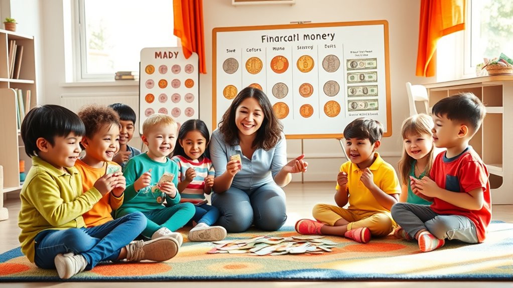 You can make money lessons fun by turning them into a playful adventure. Use interactive games that let kids earn, save, and spend pretend money—think of it as a financial amusement park. Incorporate storytelling methods to create engaging scenarios, like running a lemonade stand or shopping at a pretend store. These activities transform boring lessons into exciting experiences, helping kids learn about money without feeling like they’re in a classroom jail.