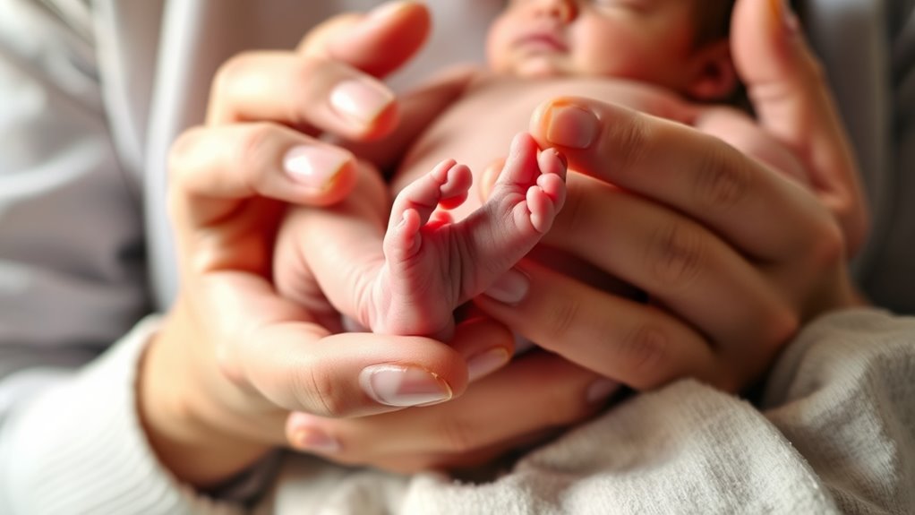 Imagine your newborn as a delicate flower, gently cradled in your hands. You’ll notice baby bonding when your little one’s tiny body relaxes, eyes soften, and they seem peaceful. Watch for infant sleep cues—if your baby’s breathing stays steady and they drift into a calm state, they’re comfortable. If they squirm or fuss, it’s a sign they might need a different hold or position to feel secure and loved.