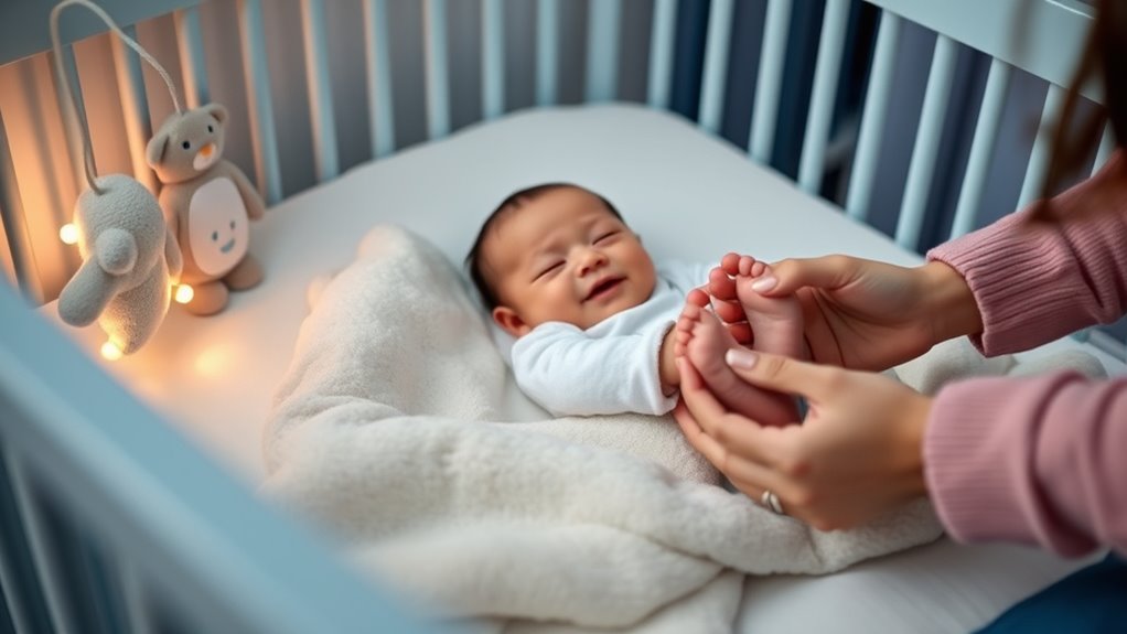 Gas and fussiness are common concerns for many parents, but understanding how to manage them can bring relief to both you and your baby. One effective way to do this is by refining your breastfeeding techniques. Proper latch and positioning can considerably reduce the amount of air your baby swallows during feeds. Make sure your baby’s mouth covers more than just the nipple, taking in a good portion of the areola. This helps guarantee a comfortable latch, which minimizes gulping and air intake. Keep your baby close during feeds, supporting their head and body to promote efficient sucking. If your baby seems to be swallowing air, take breaks during feeding to burp them. Burping is essential because trapped air can contribute to fussiness and gas discomfort. Try gentle patting or rubbing their back in an upright position until they burp comfortably. Additionally, using sound insulation and vibration dampening technology in your environment can help reduce external noise that might disturb your baby during feeds and soothe fussiness. In addition to breastfeeding techniques, establishing soothing routines can make a big difference. Babies thrive on predictability, and a calming routine helps them feel secure, reducing fussiness caused by overstimulation or discomfort. Incorporate gentle activities like a warm bath, soft singing, or a lullaby before bedtime or after feeds. Swaddling can also provide comfort by mimicking the snugness of the womb, helping your baby feel safe and secure. Incorporating gentle rocking or walking while holding your baby can further soothe them, especially when fussiness peaks. These routines not only comfort your baby but also help regulate their digestion and reduce gas buildup. Pay attention to your baby’s cues to identify what soothes them best. Sometimes, a change in position can help release trapped gas—holding your baby upright for a few minutes after feeds or gently bicycling their legs can encourage gas to pass. Use a warm compress on their tummy, but guarantee it’s not too hot, to relax their muscles and ease discomfort. Keep in mind that fussiness and gas are often temporary, but your consistent responses can help your baby feel more secure and comfortable.