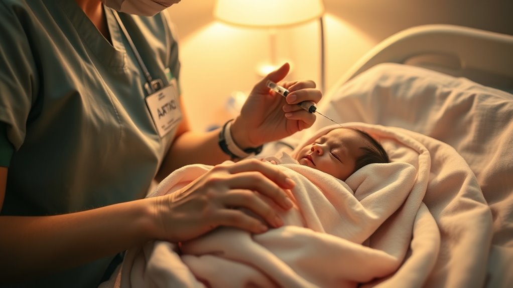 The core vaccine schedule for your newborn includes essential vaccinations given within the first month to protect against serious diseases. These vaccines are part of the recommended vaccine schedules designed to optimize immunization timing for maximum effectiveness. Typically, your baby will receive the hepatitis B vaccine shortly after birth or within the first few days. This initial shot helps prevent hepatitis B infection early on. The timing of these vaccines is carefully planned to guarantee your baby develops immunity at the right intervals. Following the scheduled immunizations, you’ll be advised when to return for subsequent doses. Staying on top of this core vaccine schedule is vital for your child’s health, laying a strong foundation for their immune system before they face more exposures. Recognizing the importance of vaccine timing can help ensure your child benefits fully from immunizations. Proper immunization schedules are crucial for effective disease prevention during these early weeks. Consistent adherence to established vaccination intervals supports the development of immunity and reduces the risk of vaccine-preventable diseases.