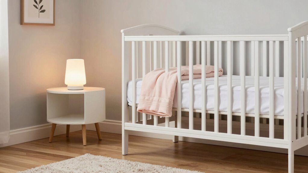 Are you wondering about the most important safety tips for maintaining a minimalist sleep environment for your baby? Keeping nursery decor simple helps reduce clutter and distractions, creating a calm space that promotes better sleep. To guarantee safety, avoid pillows, stuffed animals, or loose bedding in the crib. When it comes to sleep training, a minimalist setup makes it easier to establish consistent routines without overstimulation. Remember, a firm mattress with a fitted sheet is all you need for a safe sleep surface. If you’re concerned about your baby’s sleep safety, stick to these basics and keep the environment uncluttered. This approach not only promotes safe sleep but also simplifies your sleep training process, helping your little one develop healthy sleep habits early on.