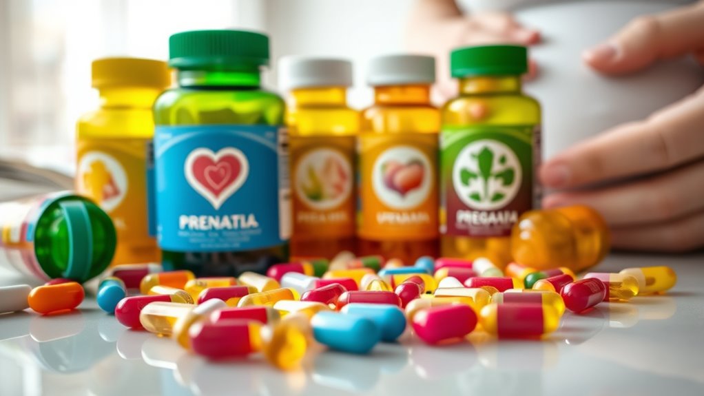 When choosing prenatal vitamins, look for key nutrients like folic acid, iron, calcium, vitamin D, and DHA to support your baby’s development and your health. Check the label for appropriate dosages—usually 400-800 micrograms of folic acid and about 27 milligrams of iron—and avoid unnecessary additives or artificial ingredients. Picking a supplement tested for safety and quality is essential. For more tips on selecting the best prenatal vitamins for you, keep exploring how to make an informed choice.