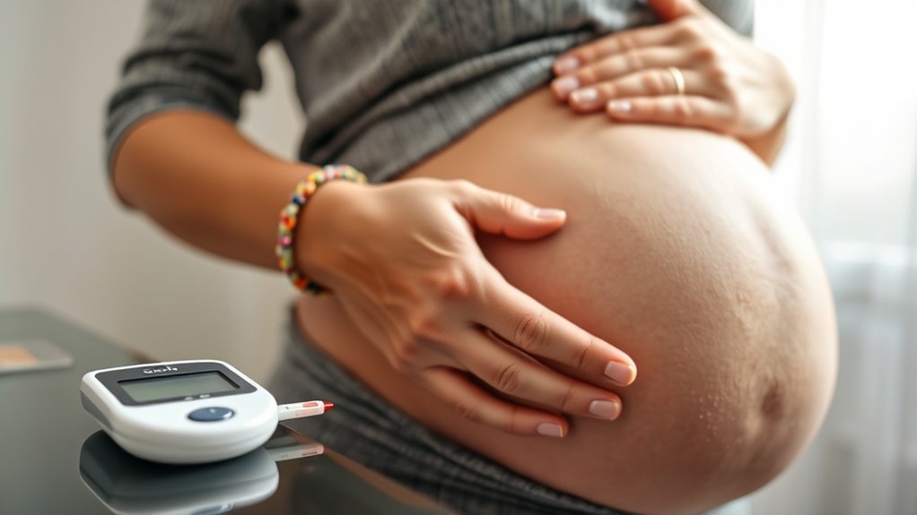 Since hormonal changes during pregnancy can cause blood sugar levels to rise when the body can’t produce enough insulin, it’s important to be aware of who might be at higher risk. High risk groups include women with a history of gestational diabetes, obesity, or polycystic ovary syndrome. Recognizing early warning signs helps you catch issues early; these include increased thirst, frequent urination, fatigue, blurred vision, and unexplained nausea. If you belong to a high risk group or notice these symptoms, notify your healthcare provider promptly. Being aware of your risk factors and early warning signs empowers you to seek timely support and manage potential complications effectively. Additionally, understanding the role of insulin resistance can help you better grasp how gestational diabetes develops. Blood sugar regulation is a complex process influenced by hormonal changes, and staying vigilant guarantees better health for you and your baby throughout pregnancy. Recognizing sugar level fluctuations can further aid in early detection and management of the condition.