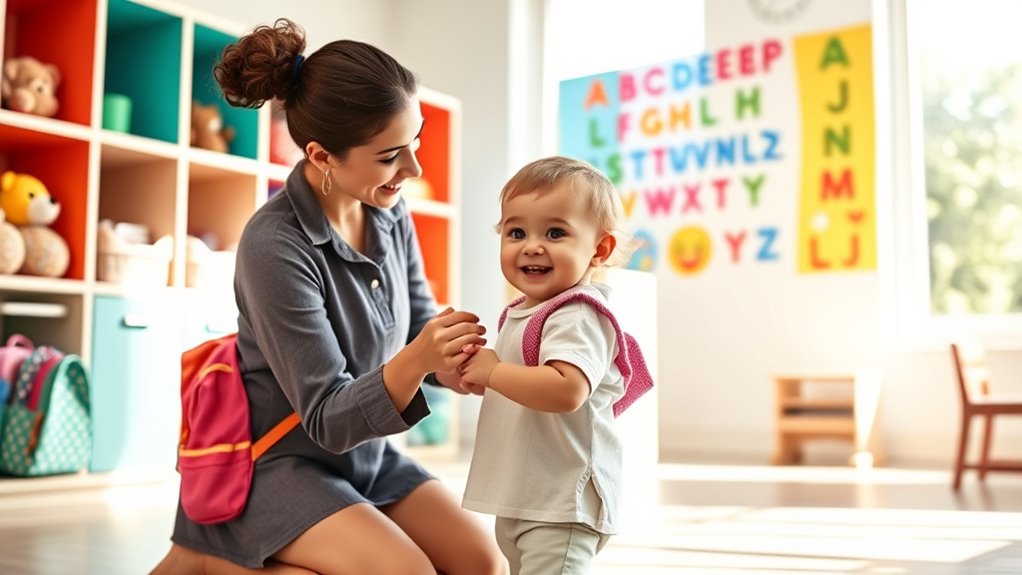 To ease your toddler into daycare, establish a consistent routine and prepare them with familiar items like a favorite toy or blanket. Talk positively about the experience, and schedule short visits beforehand if possible. Focus on creating a safe, clean environment and stay calm during drop-offs to help your child feel secure. Pay attention to their behavior for signs of distress and offer reassurance. Keep these strategies in mind to make the progression smoother—more helpful tips await as you continue.