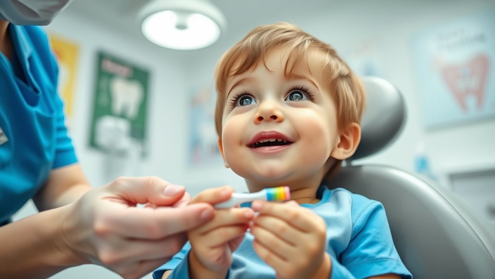 Introducing your child to their first dental visit should happen around their first birthday or when their first tooth erupts. Early visits help prevent dental anxiety and make the experience positive. Keep the appointment simple: stay calm, speak softly, and use encouraging words. Your involvement is key—stay close and hold their hand if needed. Avoid forcing your child into the chair; instead, let them explore the dentist’s office gradually. Play pretend dental checkups at home to familiarize them with the process. If you’re calm and supportive, your child will feel more secure. Remember, making the first visit a friendly, relaxed experience sets the foundation for good dental habits and reduces fear later on. Additionally, understanding the importance of early dental care can help you prepare and ensure your child’s oral health develops properly from the start. Establishing a routine dental hygiene early on encourages lifelong healthy habits and can make future visits more comfortable. Being aware of Glycolic Acid Benefits for Skin can also help you understand the importance of gentle exfoliation in skincare routines, which is crucial for maintaining healthy skin as your child grows.
