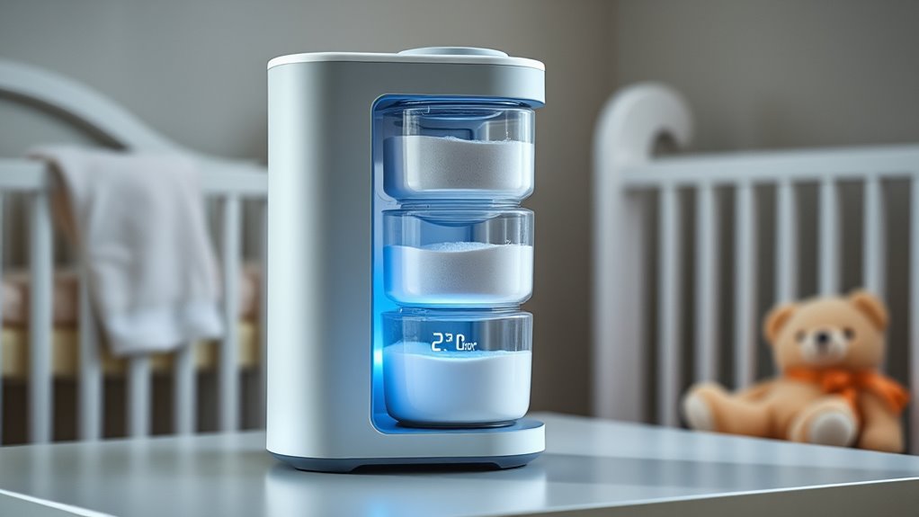 These dispensers keep the formula at a consistent temperature by using built-in heating elements or insulated chambers that maintain the desired warmth. I like how they monitor temperature continuously, automatically adjusting to stay steady. Some models also have precise controls, so I can set it exactly how I want. This guarantees my baby’s milk is always at the perfect, safe temperature without any guesswork or sudden temperature changes during feeding.