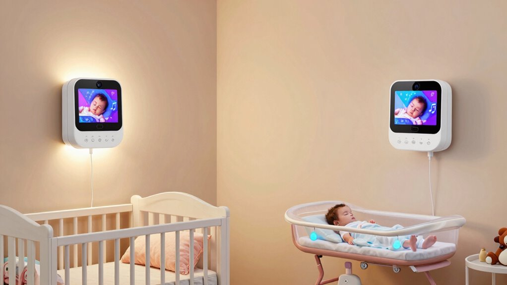 In 2026, the best baby monitors for two rooms with different kids feature multi-camera setups, long-range connectivity up to 1000 feet, and secure, interference-free wireless tech like FHSS. They offer large screens, pan-tilt-zoom cameras, and night vision for clear supervision day or night. Many include two-way talk, lullabies, and temperature sensors to keep your little ones comfortable. If you want to explore top options and find the perfect fit, keep going—there’s more to discover.