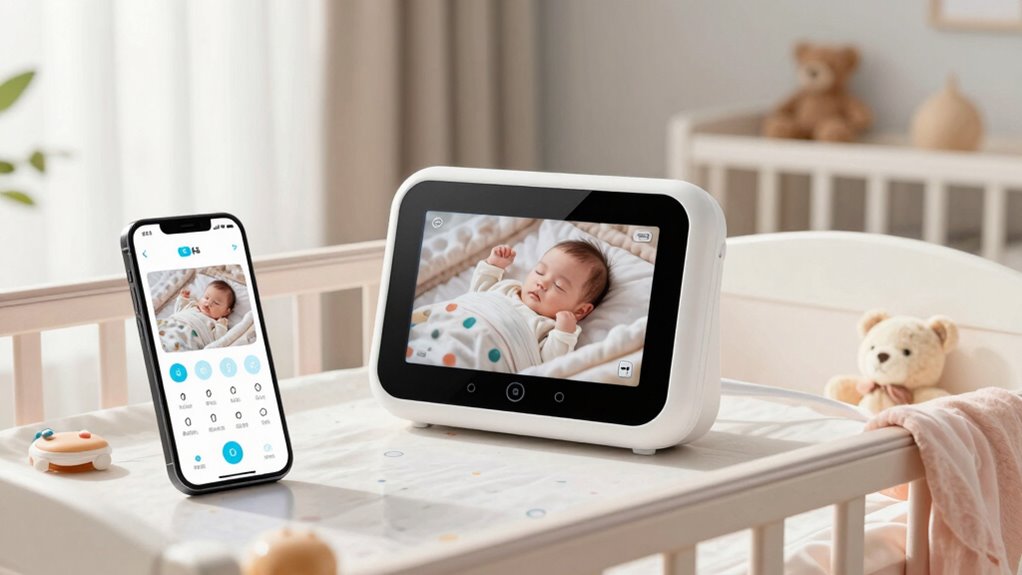 Choosing a baby monitor with a smartphone app means guaranteeing it connects smoothly and securely to your device. First, check that the monitor is compatible with your phone’s operating system—iOS or Android. Compatibility issues can cause frustrating connection problems. Next, pay attention to the Wi-Fi frequency band; some monitors need a 2.4GHz or 5GHz connection for best performance. Security is equally important—make sure the monitor supports strong encryption, like AES 128-bit, to protect your privacy. Reliable remote access with minimal lag is essential for peace of mind, so verify the stability of the stream over your Wi-Fi network. Also, review whether the app requires an account and examine its privacy policies to ensure your data remains protected.