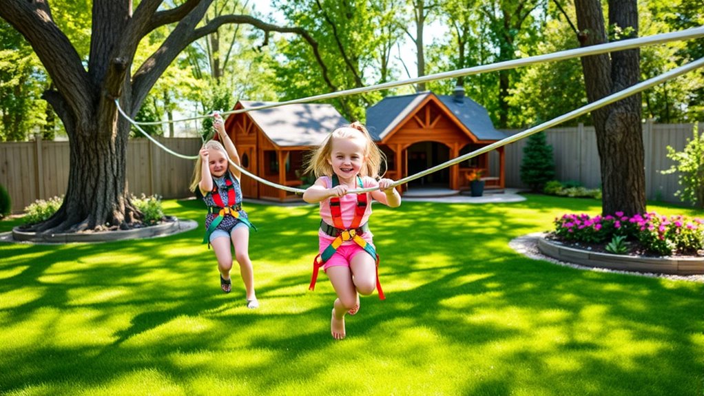 Choosing the right backyard zip line kit turns your yard into a childhood playground, much like Peter Pan’s Neverland—limitless adventure awaits. By considering length, safety features, and durability, you’re ensuring endless fun and peace of mind. Remember, a great zip line isn’t just about thrill; it’s about creating memories that last a lifetime. So, pick wisely and watch your kids’ imaginations soar—because, like in stories of old, magic begins where adventure begins.