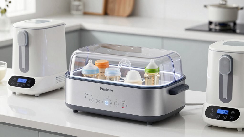 Absolutely, these sterilizers are like magic ovens for more than just bottles. They can also sanitize pacifiers, breast pump parts, teething toys, and other small baby accessories. I’ve found they work wonders on anything that fits inside, transforming everyday items into safe, germ-free treasures. Just make sure everything is dishwasher-safe and follows the manufacturer’s guidelines, and you’ll keep all your baby’s essentials pristine and protected.