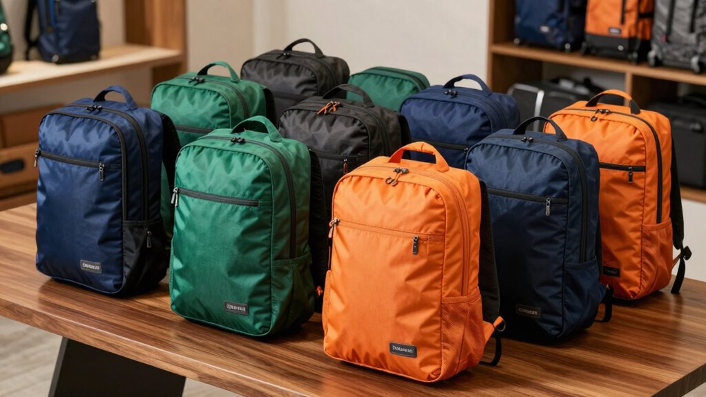 These backpacks often include security features like lockable zippers and hidden compartments, which help keep your belongings safe. Some models also have RFID-blocking pockets to protect your personal info. I appreciate how these features give me peace of mind, especially when traveling through busy areas. They’re designed to deter theft and guarantee my valuables stay secure. Overall, I feel more confident knowing my items are protected with these thoughtful security measures.