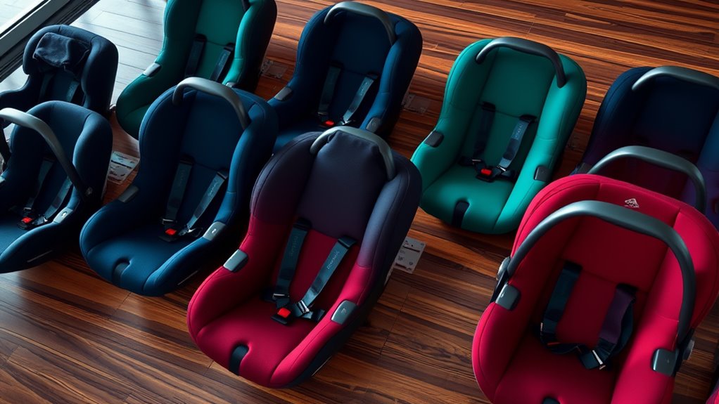Choosing a premium car seat travel cart requires careful attention to compatibility to guarantee safety and convenience. First, I verify the cart supports my specific car seat model by checking manufacturer guidelines for supported brands and types. It’s also essential to confirm if the cart supports ISOFIX, LATCH, or seat belt attachments, matching my car seat’s securement system. I look at the weight capacity, ensuring it can handle my seat’s weight, especially for larger or heavier models. Additionally, I confirm the cart fits the shape and size of my seat, whether rear-facing, forward-facing, or booster. Ultimately, I review compatibility notes about features like built-in harnesses, handles, or bases to ensure my car seat can be securely mounted for safe travel.
