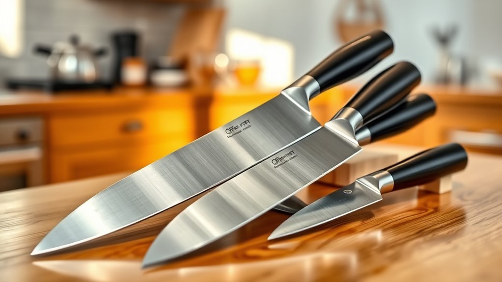 Handle materials greatly influence both durability and comfort. I prefer handles made from high-quality wood or synthetic composites because they’re sturdy and resistant to moisture, which prevents cracking and warping. Comfort-wise, textured or ergonomic designs fit my hand better, reducing fatigue during long prep sessions. Ultimately, choosing the right handle means I get a knife that lasts longer and feels comfortable, making my cooking experience smoother and more enjoyable.