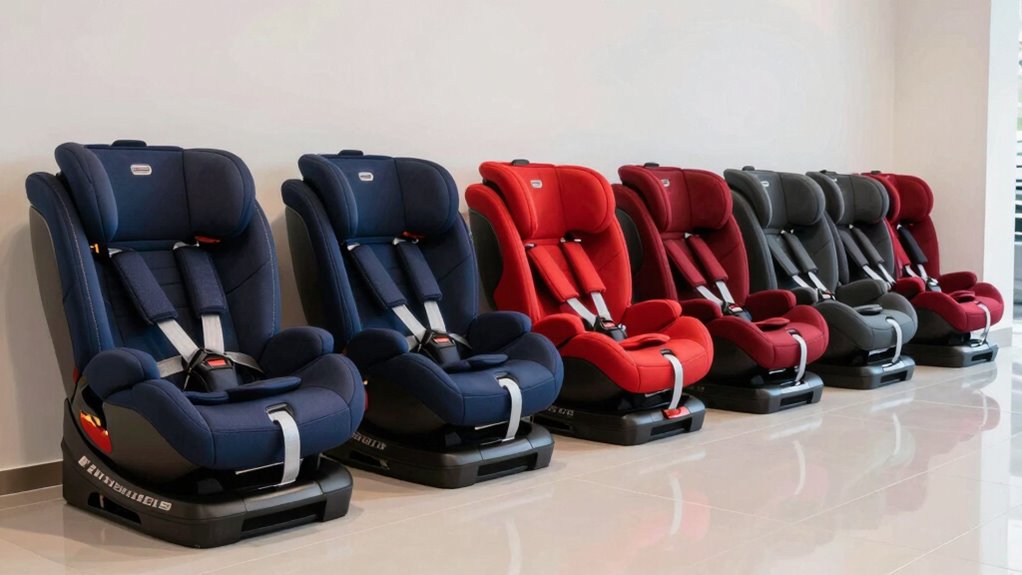 The weight limit for 5-point harnesses in these seats typically ranges from 40 to 90 pounds, depending on the specific model. I recommend checking the manufacturer’s instructions for exact limits, as they can vary. It’s crucial to stay within the recommended weight to guarantee your child’s safety. When your child approaches the limit, consider switching to a booster seat for continued protection.