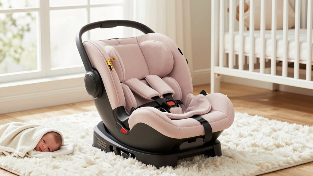 Ensuring your chosen convertible car seat meets or exceeds federal safety standards is essential for your newborn’s protection. Look for seats that comply with regulations like FMVSS 213 or its equivalents, which guarantee the seat has undergone rigorous testing. Verify that the seat has been tested specifically for side-impact protection, a critical safety feature. Certification labels indicating adherence to recognized safety standards provide peace of mind, confirming the seat’s tested safety performance. It’s also important to confirm that the seat has undergone crash testing for structural integrity across various collision scenarios. Additionally, features like secure installation systems and safety indicators can help guarantee the seat is properly attached, further enhancing safety compliance. Prioritizing these standards helps protect your little one during every trip.