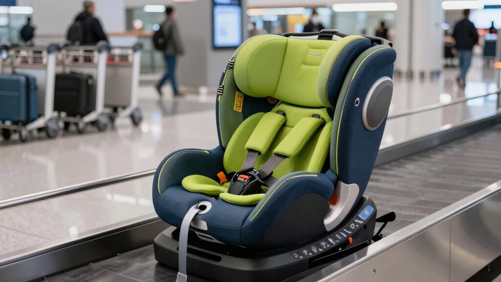 Choosing a convertible car seat for airplane travel requires careful attention to size and portability, since these factors directly impact how easily you can carry and store the seat during your trip. Look for seats that fold into a compact size, ideally around 11-19 inches in length, width, or height, making them easier to stow in overhead compartments or under seats. A lightweight model, under 10 pounds, allows for comfortable carrying through airports without strain. A slim profile, about 10 inches wide or less, maximizes space in airplane seats and helps fit multiple seats in the back row. Additionally, seats with integrated carry handles or that double as backpacks or attach to rolling luggage offer extra convenience, making your travel experience smoother.