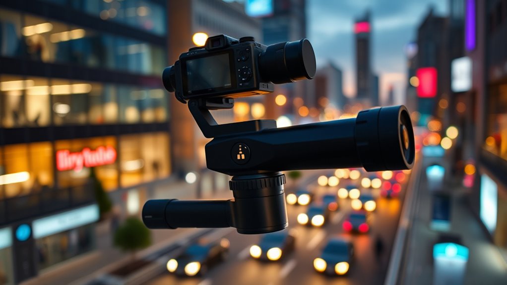 When choosing a gimbal stabilizer, considering additional features and accessories can considerably boost its versatility and creative potential. Features like focus wheels, zoom sliders, and built-in lights give me greater control and expand my filming options. Compatibility with remote controls, mobile apps, or AI tracking allows for hands-free operation and smooth subject following, making complex shots easier. Mounting options such as hot shoe adapters and quick-release systems enable quick setup and seamless switching between accessories. Some stabilizers include ports for external microphones or LED lights, broadening content possibilities. Extras like gesture control, preset modes, and customizable controls help tailor the stabilizer’s functionality to my specific needs, ensuring I get the most out of my gear for professional-looking footage.