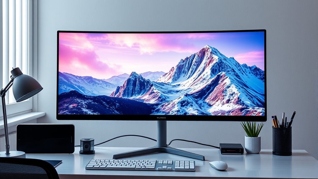 High-end 4K monitors excel in color accuracy and wide gamuts, which are essential for professional workflows that demand precise and vibrant visuals. Many support wide color gamuts like 99% sRGB, 93% DCI-P3, or even full Adobe RGB coverage, ensuring rich, true-to-life colors. Precise calibration, often factory-calibrated, guarantees consistent color reproduction across tasks, whether photo editing, design, or video work. A higher bit depth, such as 10-bit color, enables smoother gradations and minimizes banding, critical for detailed digital work. HDR support, like HDR10, boosts color volume and contrast, making visuals more realistic and immersive. Ultimately, the combination of panel technology and color management systems determines color accuracy, making gamut coverage a fundamental factor in high-end productivity monitors.