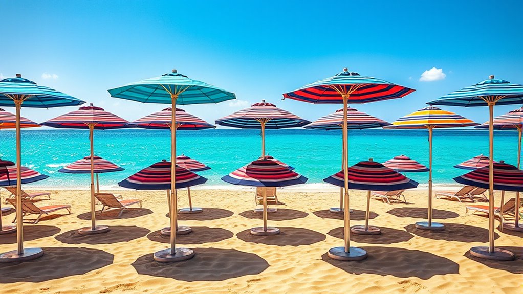 When it comes to premium beach umbrellas, the sky’s the limit with accessories. I love adding weighted bases to keep it steady and stylish LED lights for evening ambiance. A tilt mechanism enhances sun protection, and a UV-protective canopy adds extra shade. Don’t forget convenient side pockets for essentials. These accessories turn a simple umbrella into a luxe, functional oasis, making your beach day truly first-rate.