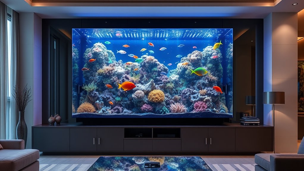 Modern high-end fish aquariums harness advanced technology to simplify management and enhance aquatic environments. I love how integrated smart controls let me manage lighting, temperature, and feeding schedules effortlessly through my phone. Many models include automatic water quality monitors that track pH, ammonia, and nitrates, helping me keep my fish healthy without constant testing. Energy-efficient LED lighting with customizable spectra promotes coral growth and intensifies fish colors, making the tank look stunning. Some systems feature automated filtration and circulation with self-cleaning functions, reducing maintenance time. Innovative designs also offer remote diagnostics and alerts for equipment issues or water parameter deviations, so I can address problems proactively. These features make high-end aquariums smarter, easier to maintain, and more visually engaging.