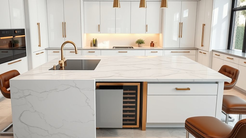 I recommend choosing durable materials like quartz, granite, or marble for high-end kitchen islands. Quartz is especially tough and low-maintenance, making it perfect for everyday use. Granite offers natural beauty and resilience, while marble adds luxurious elegance but requires a bit more care. I prefer these options because they combine style with practicality, ensuring your island withstands daily wear and tear while elevating your kitchen’s overall look.