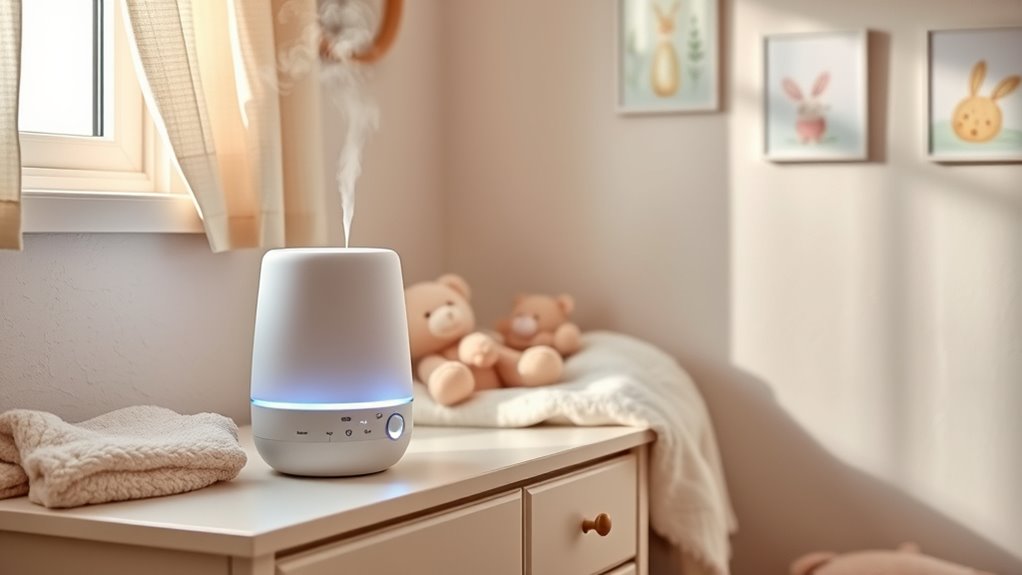 I recommend cleaning your device weekly to keep it safe and effective. I’ve found that checking filters and replacing them every 1-3 months prevents buildup and mold. When I forget, I notice it doesn’t work as well. It’s also good to empty, dry, and disinfect the tank regularly. Staying consistent with this routine guarantees your nursery stays healthy and your little one’s environment remains fresh and safe.