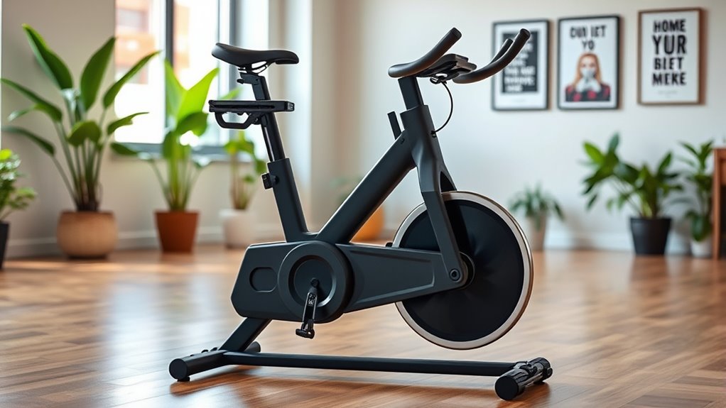 Maximizing space is essential when selecting an indoor cycling bike for a home gym, especially if your area is limited. Compact, foldable bikes can save up to 50% of space, making them perfect for small rooms. Bikes with built-in transport wheels are easy to move and store, helping you optimize your space. Multi-functional designs that combine resistance bands and monitor displays reduce the need for extra equipment. Slim profiles and vertical orientations help prevent clutter and blend seamlessly with your home decor. Additionally, many space-efficient bikes feature quick assembly and disassembly, so you can set up or pack away your equipment with ease. These features ensure you get a quality workout without sacrificing valuable floor space.