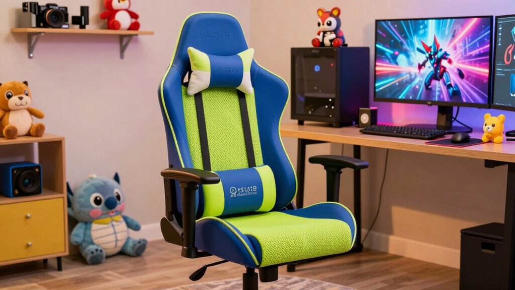 Have you ever noticed how a simple adjustment can make a huge difference in comfort during long gaming sessions? Adjustable seat height is key, ensuring kids sit with their feet flat on the floor and knees at a 90-degree angle. Most chairs offer a range from 17 to 22 inches, fitting children of various ages and sizes. Proper height aligns their eyes with the top of the screen or work surface, reducing eye strain. It also promotes good posture by keeping hips, back, and shoulders in correct alignment. A quick and secure height adjustment mechanism is essential so that as children grow, their chair can adapt easily. This feature helps maintain ergonomic benefits over time, making gaming both comfortable and healthy.