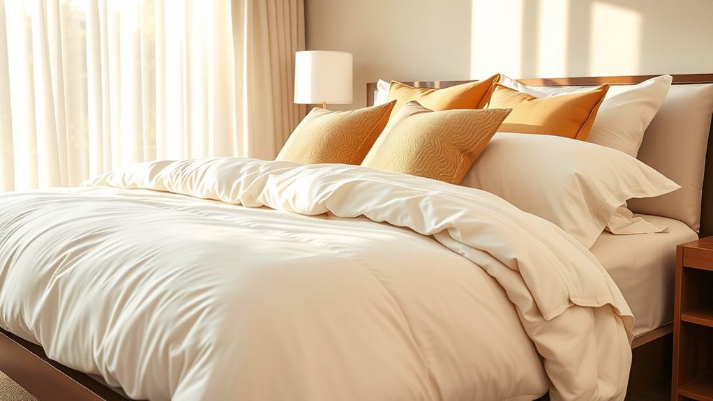 Breathability and cooling are essential qualities to contemplate because they directly influence how comfortably you sleep through the night. I look for bedding made from breathable materials like Egyptian cotton, bamboo, or satin, which promote air circulation and help regulate my body temperature. Natural fibers such as bamboo-derived rayon and Egyptian cotton wick moisture away from my skin, reducing overheating and sweating. Sheets with a sateen or percale weave allow better airflow compared to denser fabrics, enhancing comfort. Additionally, deep pockets and elasticized edges ensure a snug fit, preventing bunching that traps heat. Thermoregulating fabrics are also a game-changer—they stay cool in summer and warm in winter, providing consistent comfort. Choosing bedding with these qualities guarantees a more restful, temperature-balanced sleep.