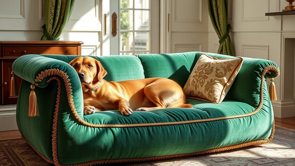 If you want to treat your pet like royalty, I recommend checking out luxurious options that offer orthopedic support, plush faux fur, and stylish designs that blend seamlessly with home decor. These beds are not only beautiful but also prioritize comfort, safety, and easy maintenance. From donut-shaped plush bowls to sophisticated chaise lounges, the right bed can help your pet relax and feel secure. Keep exploring to find the perfect regal spot for your furry friend.