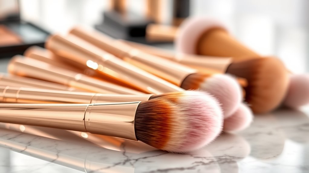 Think of luxury brushes as fine art compared to mass-produced prints. They’re made with high-quality materials like natural or synthetic fibers, which feel softer and grip makeup better. I once used a luxury brush that glided effortlessly across my skin, unlike cheaper options. These premium materials guarantee precise application, durability, and a flawless finish, making your makeup look professional and polished every time.