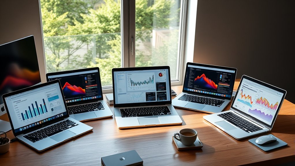 High-end MacBook Pros in 2025 feature advanced thermal designs to keep performance ideal. I’ve noticed they use improved heat sinks, larger fans, and better airflow management, which helps dissipate heat efficiently during demanding tasks. Apple’s cooling solutions are quiet and effective, allowing me to push the hardware without worrying about overheating. This ensures sustained performance, especially when running intensive applications or multitasking for extended periods.