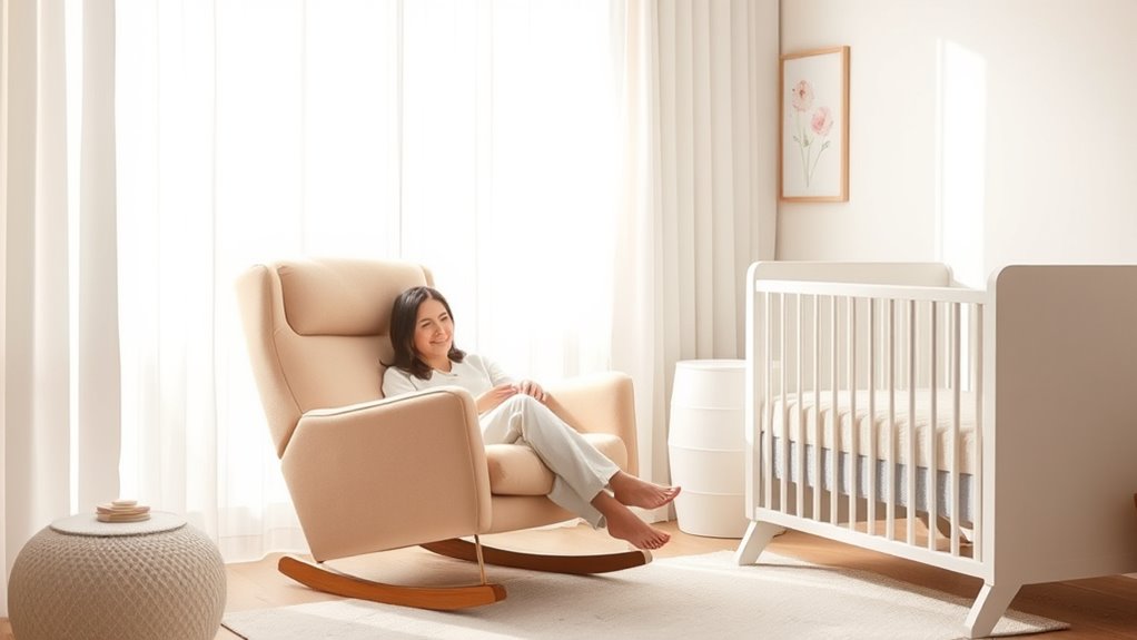 For petite moms, ease of entry and exit is a crucial factor when selecting a nursery glider. A low seat height, around 17-18 inches, makes sitting down and standing up much easier. Look for a design with wide, accessible armrests or open armrests that allow for smooth, unobstructed movement. A glider with a gentle, effortless gliding or rocking mechanism reduces the effort needed to get in and out. It’s also important to contemplate the overall size and depth of the seat—avoid bulky or overly deep chairs that can be hard to rise from comfortably. Supportive armrests and a stable base help maintain balance during transitions. Prioritizing these features ensures petite moms can comfortably and confidently use the glider whenever needed.