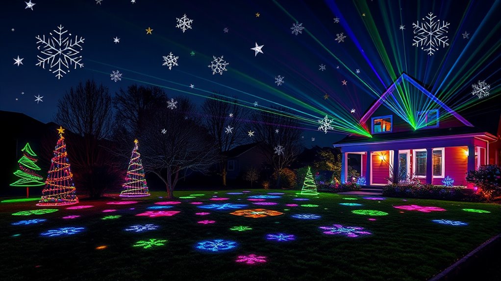 If you’re looking to transform your holiday decor, I recommend checking out top outdoor Christmas projectors that are bright, weatherproof, and easy to install. Models with dynamic effects like snowflakes, reindeer, and Christmas trees can cover large areas and create stunning visual displays. Whether you prefer laser, HD, or multi-pattern options, the best ones are adjustable, remote-controlled, and built to withstand the elements. Keep exploring to find the perfect projector for your festive needs!