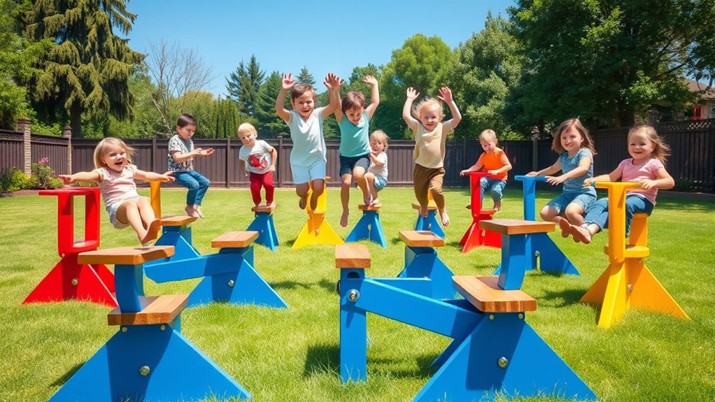 Premium outdoor teeter totters often include essential safety features like durable, non-slip handles that guarantee a secure grip and sturdy, weather-resistant seats for added stability. Many models also incorporate reinforced pivot points to prevent wobbling and safety stops to prevent over-rotation. I always look for these features because they help keep kids safe while enjoying endless fun, giving me peace of mind during playtime.