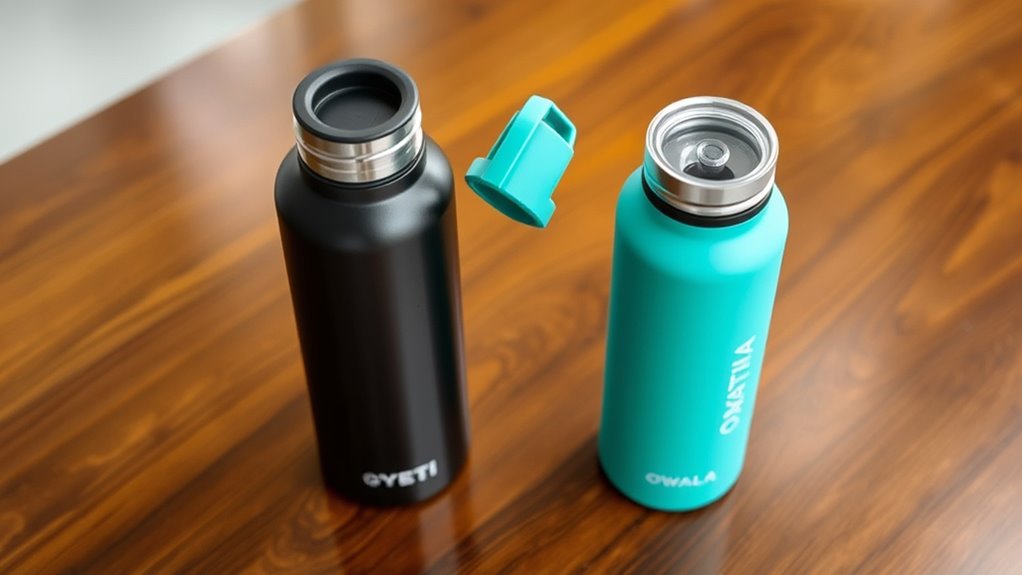 Ever wondered how lid designs affect spill resistance? I’ve found that Owala bottles often have flip or push-button lids that lock securely, making spills less likely. Yeti bottles usually feature screw-on caps, which are reliable but can be tricky if not tightened properly. So, if you want maximum spill-proof performance, look for lids with locking mechanisms or secure seals. Isn’t it comforting to know your drink stays put?