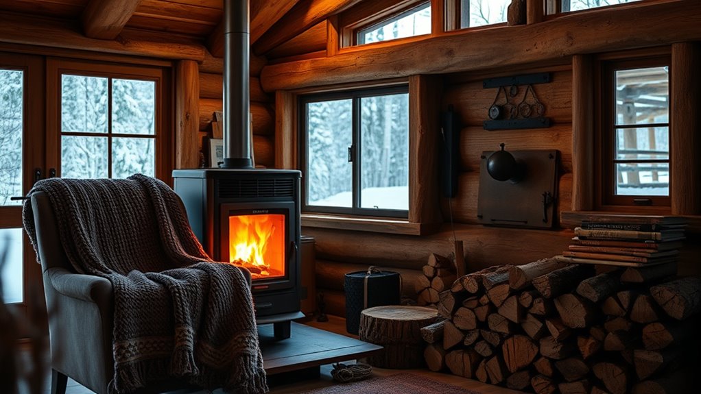 When choosing a pellet stove for your off-grid cabin, it’s vital to take into account your heating needs, size of the space, and fuel capacity. No one-size-fits-all solution here—think of it as finding the right tool for the job. With the right stove, you’ll stay cozy no matter the weather. Remember, it’s better to be safe than sorry—invest wisely, and you’ll keep the chill at bay for years to come.