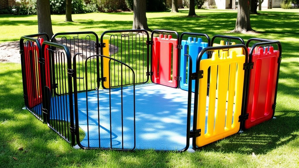 The versatility and configuration options of an 8-panel heavy-duty play yard make it a practical choice for various spaces and needs. I appreciate how I can arrange it in straight lines, octagonal shapes, or even custom layouts to fit different areas. The modular design allows me to easily expand or shrink the enclosure by adding or removing panels, adapting to my changing requirements. Adjustable hinges support both angled and straight setups, making it versatile for indoor or outdoor use. Many models feature removable panels, reversible stakes, or multiple configuration modes, so I can use the yard as a barrier, play area, or pet enclosure. Plus, its lightweight, foldable design means I can quickly set up or pack away the yard, making it suitable for a variety of locations.