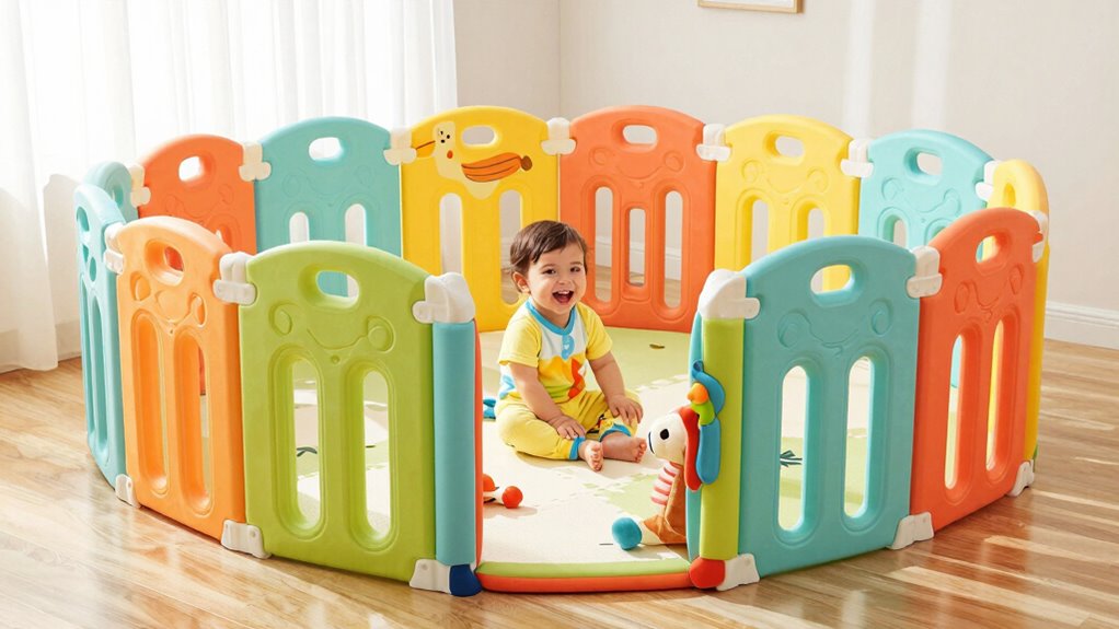 If you’re looking for the best large playpens for 2026, I’ve found top options that keep kids safe and happy. These include acrylic, wooden, mesh, and foldable models, all designed for stability, visibility, and easy supervision. They offer plenty of space, safety features, and portability for indoor or outdoor use. Keep in mind the materials, safety certifications, and shape to find the perfect fit for your home. Stick around to learn more about each option.