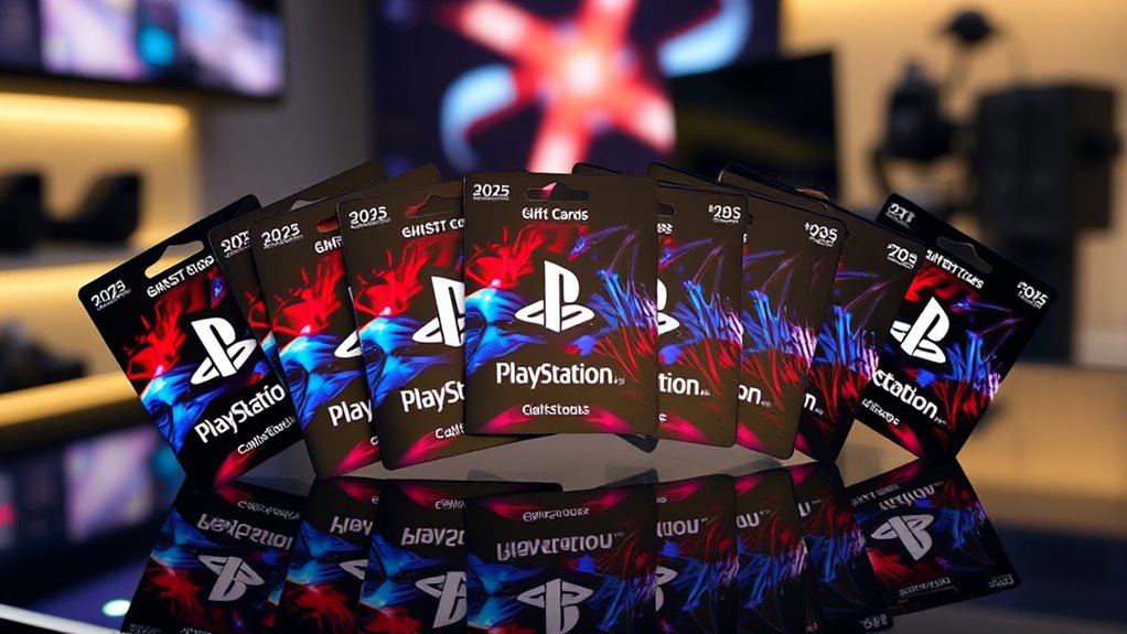 Looking for the best PlayStation Store gift cards for instant gifting in 2025? I recommend options like digital codes in various amounts such as $25, $100, $200, and $250, which deliver instantly via email for quick use. Physical cards in denominations like $25, $50, and $100 are also great for mailing or gifting in person. If you want to learn about the top choices and how to choose the right one, keep exploring.