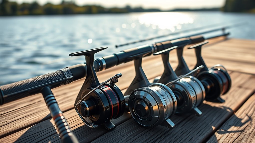 Have you ever considered how reel speed impacts your fishing experience? Reel speed is indicated by the gear ratio, which shows how many inches of line are retrieved per handle turn. High gear ratios, like 6.2:1 or above, enable quick line retrieval, perfect for fast lure presentations or reeling in fish swiftly. Conversely, lower gear ratios, around 5.2:1 or less, offer more torque, making them ideal for fighting larger fish or techniques requiring extra power. Matching reel speed to your fishing style is essential—finesse fishing benefits from slower reels, while tournament or fast-action fishing demands faster ones. Reel speed affects line pickup efficiency, reduces fatigue during long sessions, and enhances responsiveness across different scenarios, so choosing the right gear ratio can make a significant difference in your success.